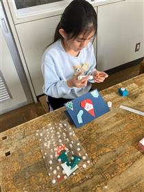 子どもたちは先生の話をしっかり聞いていましたが、平面の画用紙から立体を捉えることがむずかしかったようで、苦戦しながらも無事にひな壇ができあがりました。
