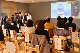 | 「福岡県の取り組み内容」について、福岡県ワンヘルス総合推進室の左藤室長から紹介していただきました。 | 大牟田市動物園と連携して取り組んできた「動物福祉に関する学習及び研究内容」について、大牟田中央小学校6年生の児童の皆さんから紹介していただきました。 |