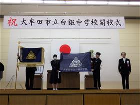桜の花吹雪が舞う4月8日(火)、在校生や御来賓、地域の方や教職員など、たくさんの方々に見守られながら、厳粛な雰囲気の中で、御木中学校と白銀中学校が開校しました。