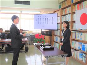 谷本教育長から研究員一人一人に委嘱状が交付され、研究員代表が、「深まりのある研究になるように、自己研鑽していきます。」と決意の言葉を述べました。谷本教育長からは、「子どもが主体となった授業のあり方について探求し、先生方の授業力向上と子どもたちの学力・体力向上につなげていただきたい。」と激励の言葉がありました。